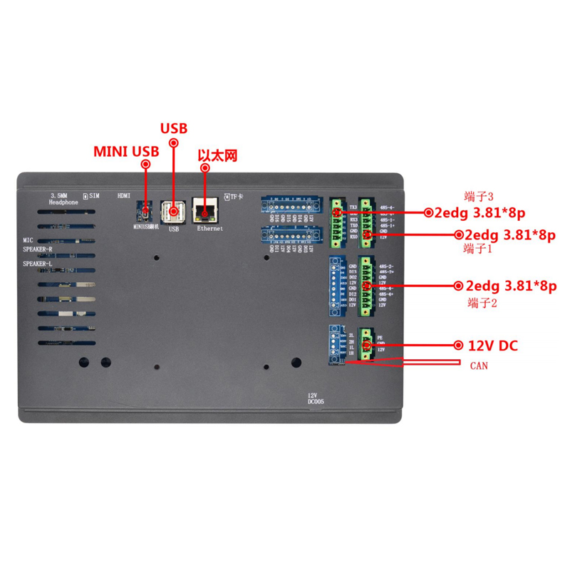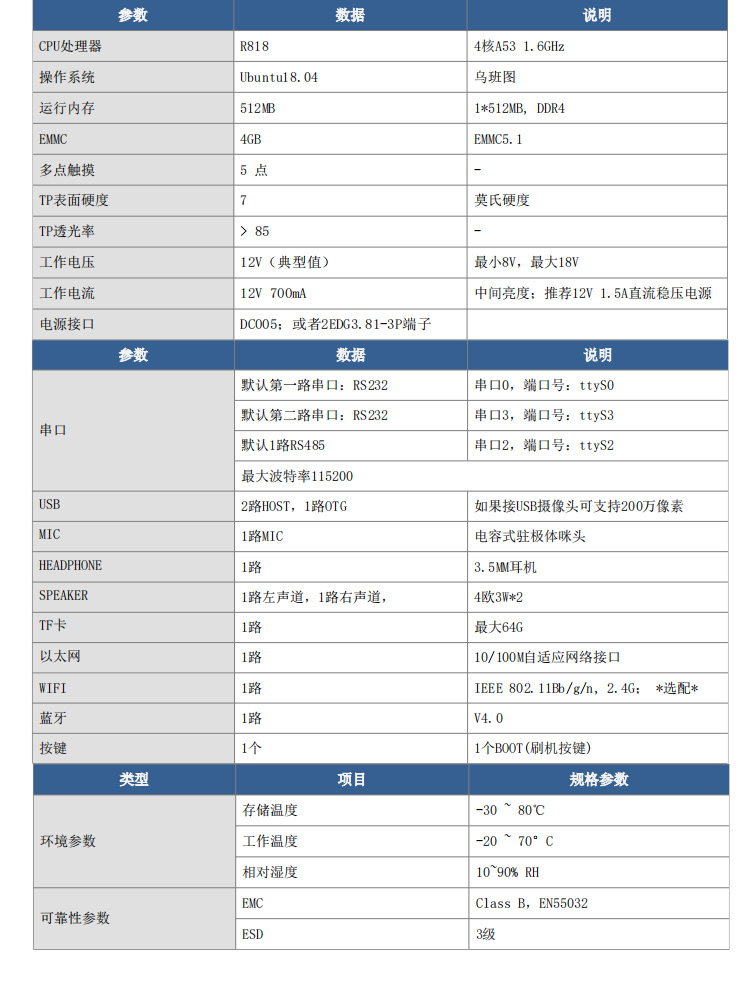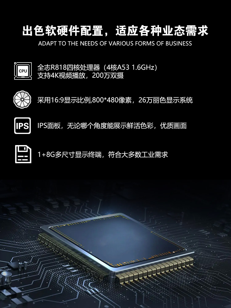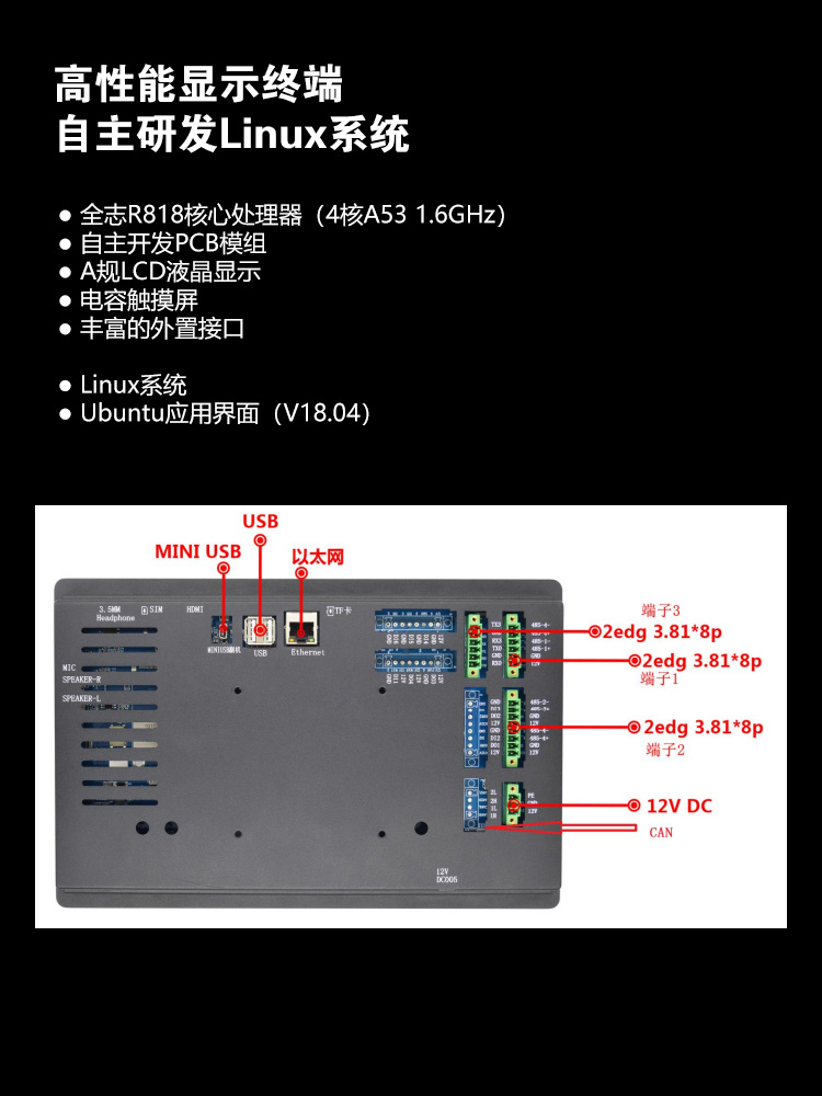 特点描述:XA101LRK15W(B)系列,是15vip太阳成基于ARM A53架构自主研发设计的一款工业Linux智能触控显示终端,由底板、LCD显示屏及触摸屏组成。搭载全志R818四核处理器,Ubuntu18.04操作系统,支持自主设计程序安装;全新丽色显示系统,支持自主调节冷暖色调;支持4K视频播放, 200万双摄;接口资源丰富,用户可通过 RS232、RS485、TTL等串口端口与外部设备进行通信;也可以通过WIFI/以太网联网、浏览网页、播放音乐、播放视频、远程升级更新等。