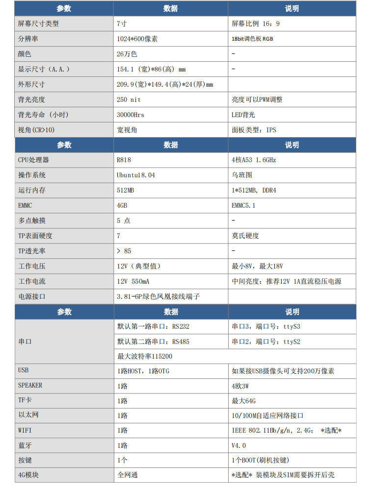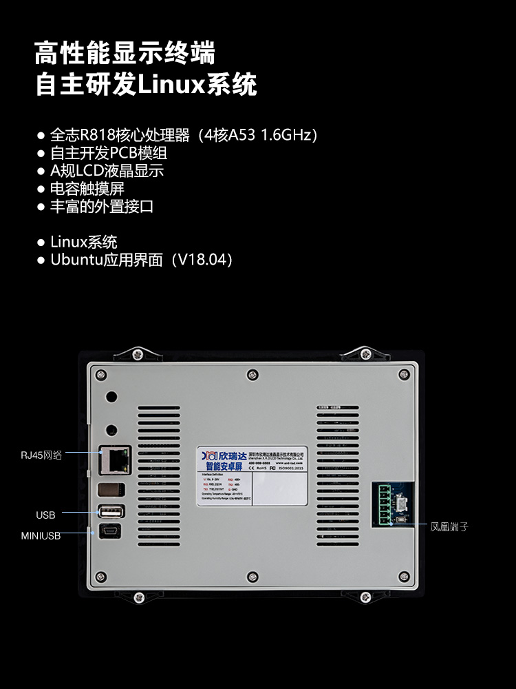 特点描述:XN070LRK15W系列,是15vip太阳成基于ARM A53架构自主研发设计的一款工业Linux智能触控显示终端,由底板、LCD显示屏及触摸屏组成。搭载全志R818四核处理器,Ubuntu18.04操作系统,支持自主设计程序安装;全新丽色显示系统,支持自主调节冷暖色调;支持4K视频播放, 200万双摄;接口资源丰富,用户可通过 RS232、RS485、TTL等串口端口与外部设备进行通信;也可以通过WIFI/以太网联网、浏览网页、播放音乐、播放视频、远程升级更新等。