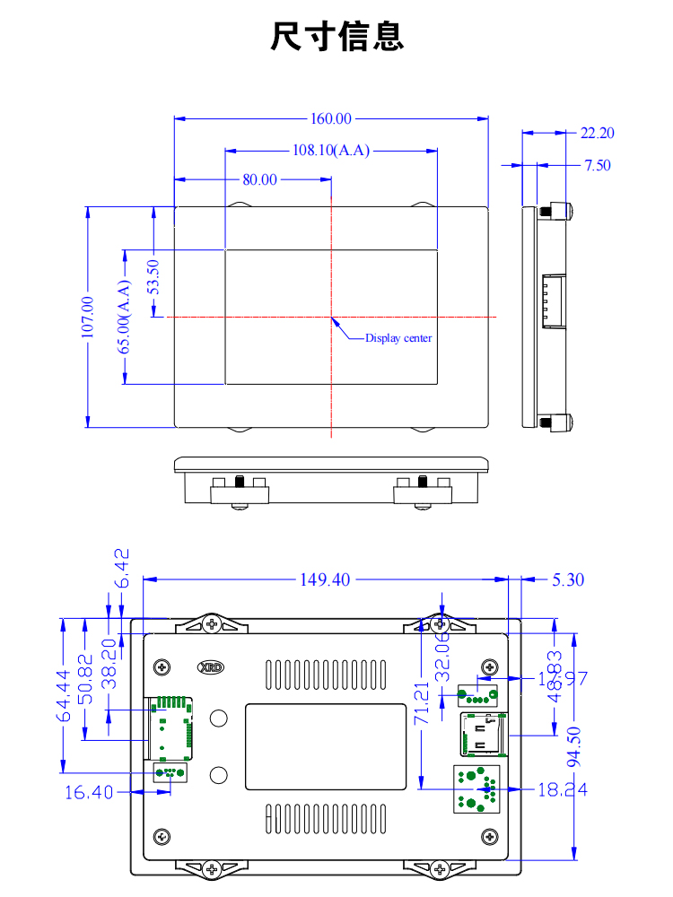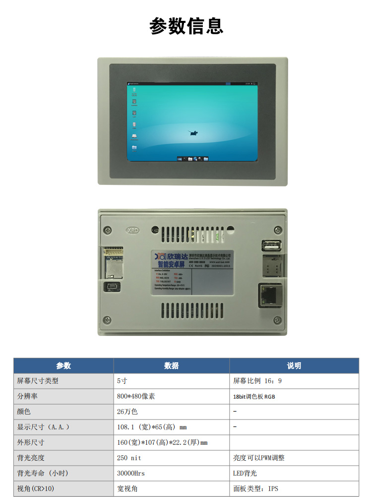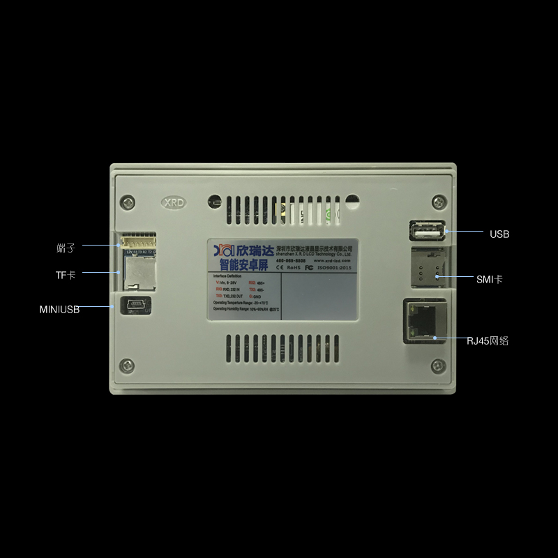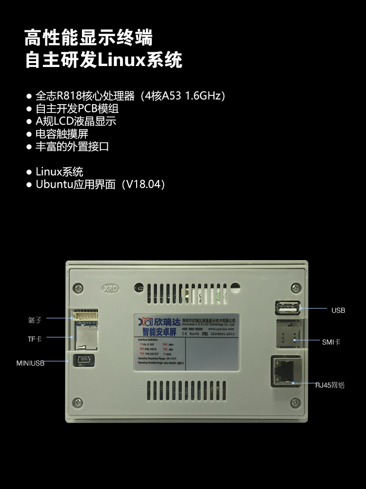 特点描述:XN050YRK15W系列,是15vip太阳成基于ARM A53架构自主研发设计的一款工业Linux智能触控显示终端,由底板、LCD显示屏及触摸屏组成。搭载全志R818四核处理器,Ubuntu18.04操作系统,支持自主设计程序安装;全新丽色显示系统,支持自主调节冷暖色调;支持4K视频播放, 200万双摄;接口资源丰富,用户可通过 RS232、RS485、TTL等串口端口与外部设备进行通信;也可以通过WIFI/以太网联网、浏览网页、播放音乐、播放视频、远程升级更新等。