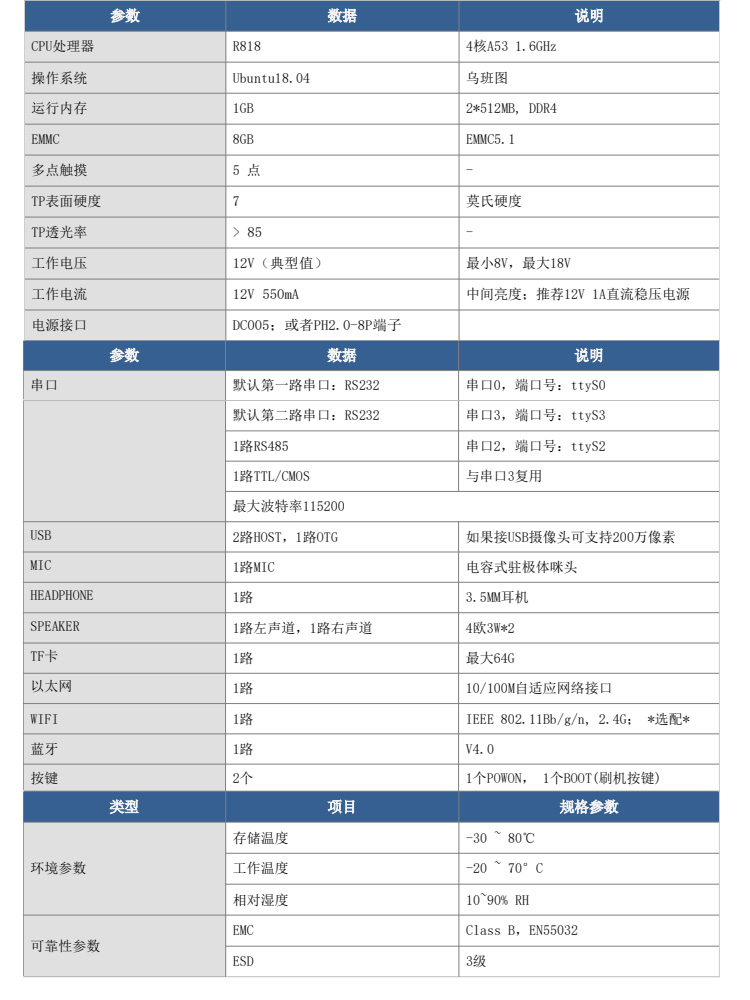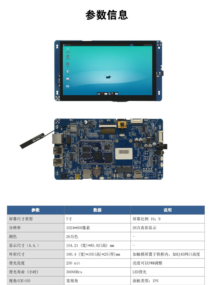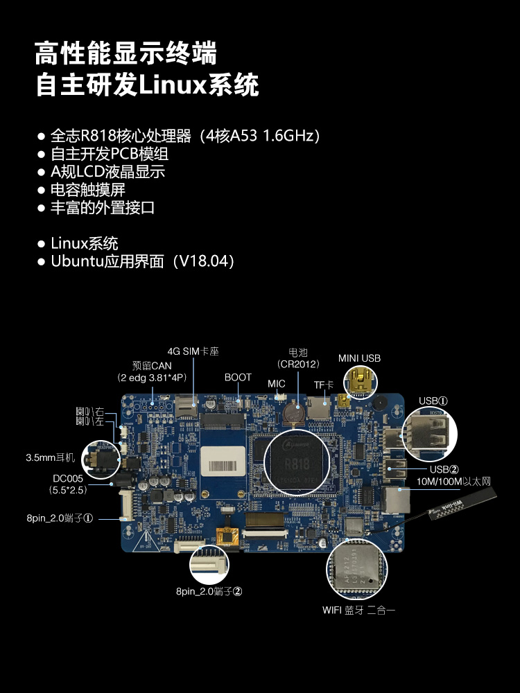 特点描述:XN070LRI01W系列,是15vip太阳成基于ARM A53架构自主研发设计的一款工业Linux智能触控显示终端,由底板、LCD显示屏及触摸屏组成。搭载全志R818四核处理器,Ubuntu18.04操作系统,支持自主设计程序安装;全新丽色显示系统,支持自主调节冷暖色调;支持4K视频播放,200万双摄;接口资源丰富,用户可通过 RS232、RS485、CAN等串口端口与外部设备进行通信;也可以通过WIFI/以太网联网、浏览网页、播放音乐、播放视频、远程升级更新等。