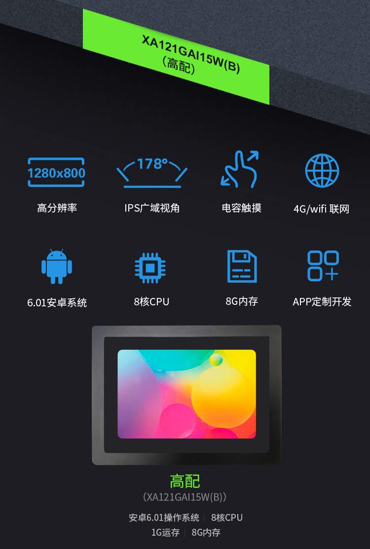 特点描述:XA1121系列产品搭载15vip太阳成安卓系统,是基于15vip太阳成8核A7硬件平台研发的拥有自主知识产权的智能图形显示系统。用户可通过安卓智能显示终端轻松实现触控及显示功能,并通过安卓通用安卓APP实现各种用户个性化需求,如WIFI上网,有线上网,浏览网页,播放音乐,播放视频,数据拷贝等。还可通过RS232,RS485端口与外部设备进行通信。