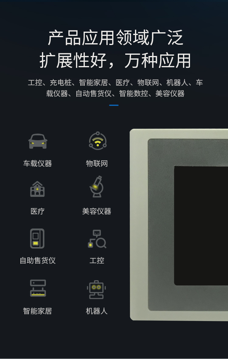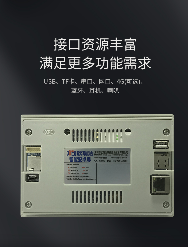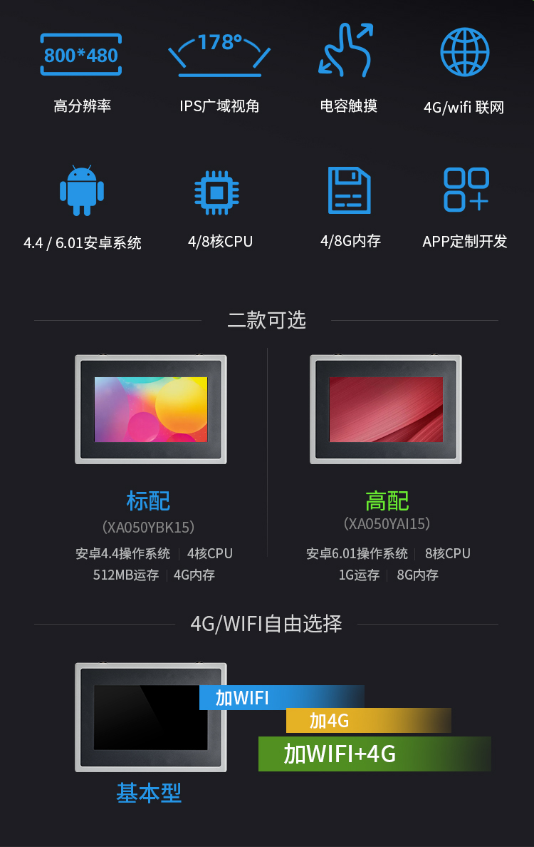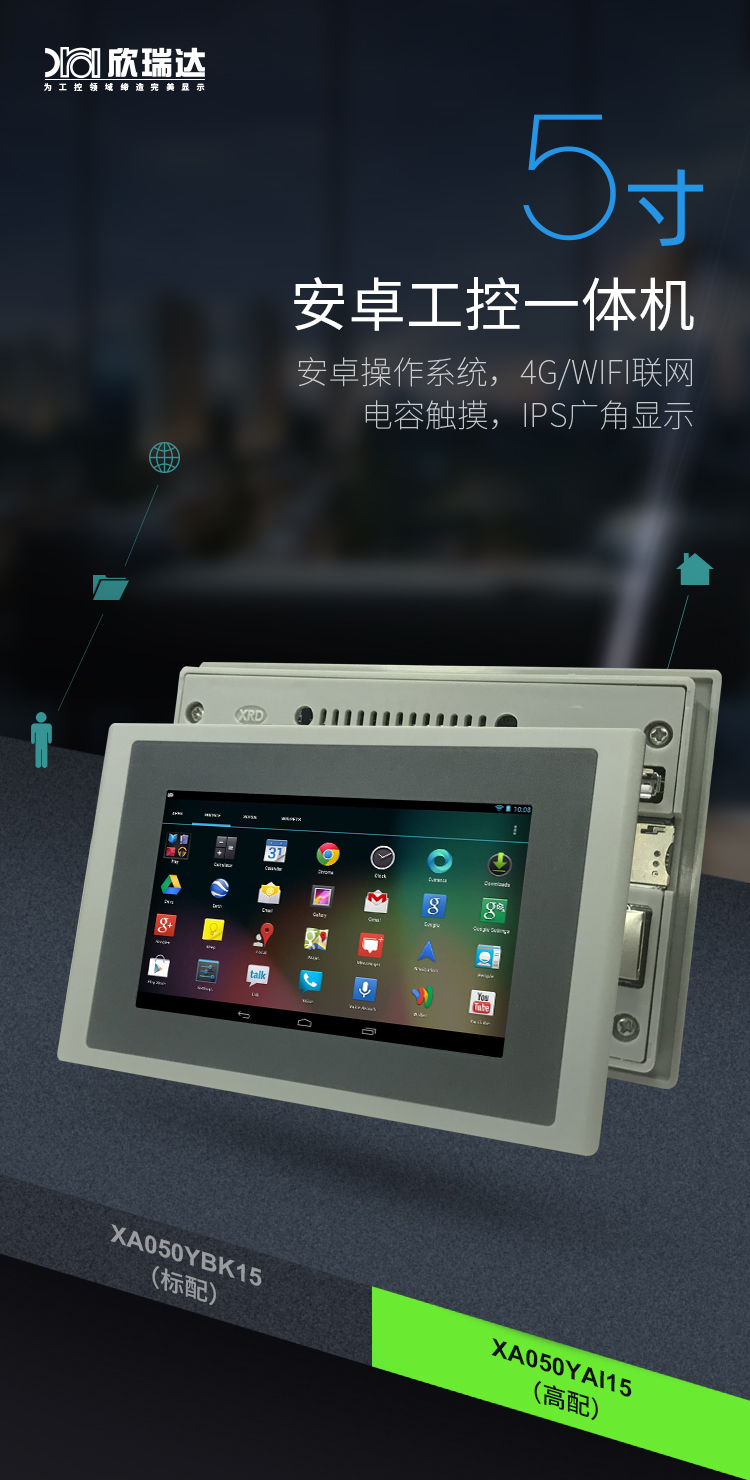 特点描述:XA050系列产品搭载15vip太阳成安卓系统,是基于15vip太阳成8核A7硬件平台研发的拥有自主知识产权的智能图形显示系统。用户可通过安卓智能显示终端轻松实现触控及显示功能,并通过安卓通用安卓APP实现各种用户个性化需求,如WIFI上网,有线上网,浏览网页,播放音乐,播放视频,数据拷贝等。还可通过RS232,RS485端口与外部设备进行通信。