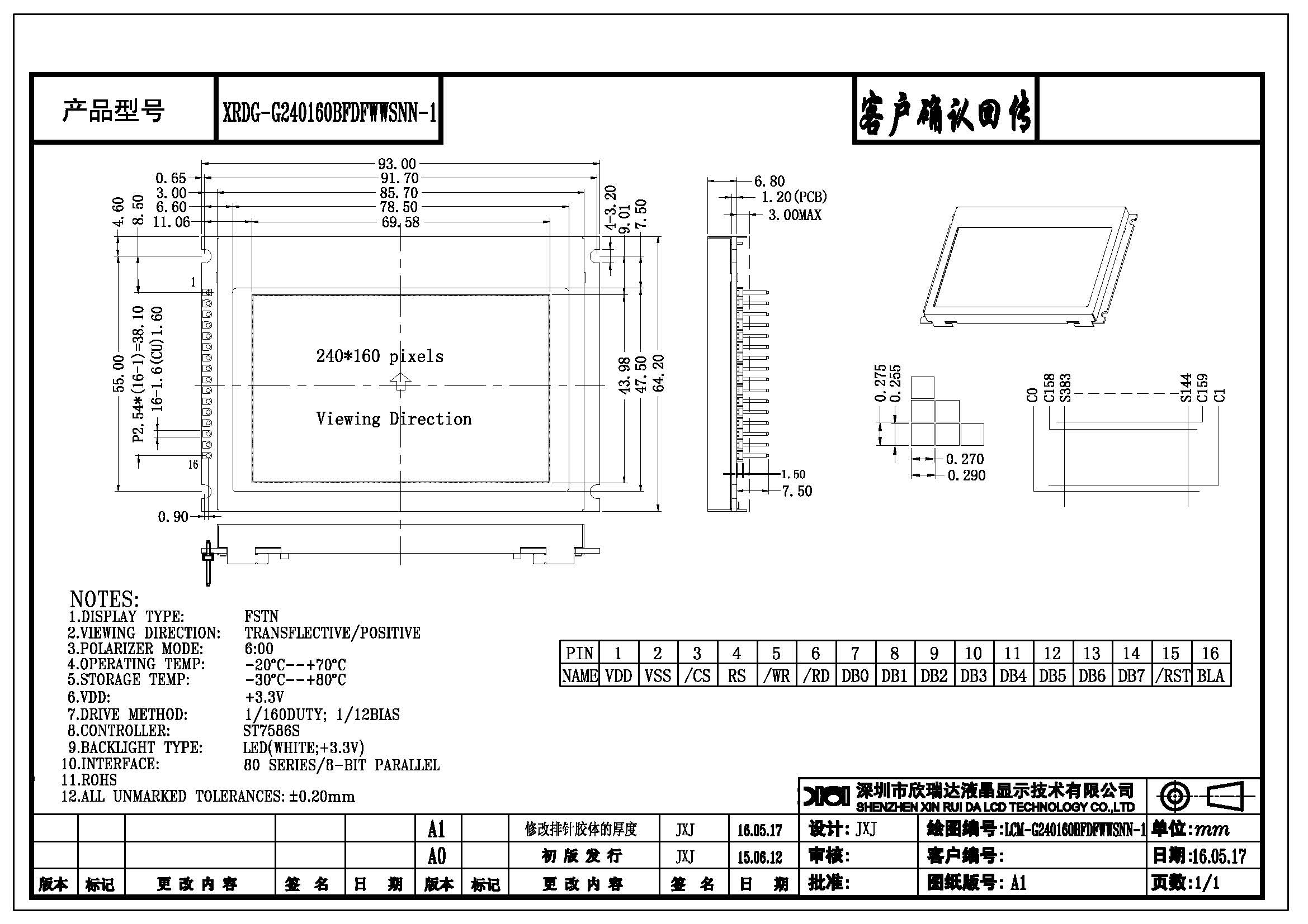 特点描述:240160液晶显示模块:G240160A 点阵:240*160 工艺:COG