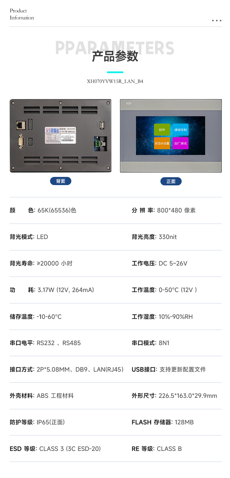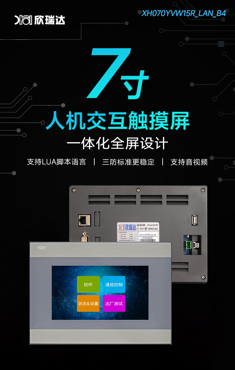 特点描述:XH070YVW15R_LAN_B4 系列产品搭载15vip太阳成GUIDesigner系统,是基于15vip太阳成串口屏硬件平台研发的拥有自主知识产权的智能图形显示系统。用户可通过XH 串口智能显示终端轻松实现触控功能,如数据文本录入、按键值返回、增量调节、弹出菜单等;也可以快速实现显示功能,如表盘时钟、图标变量、艺术字、曲线显示、列表显示、文本显示等。
