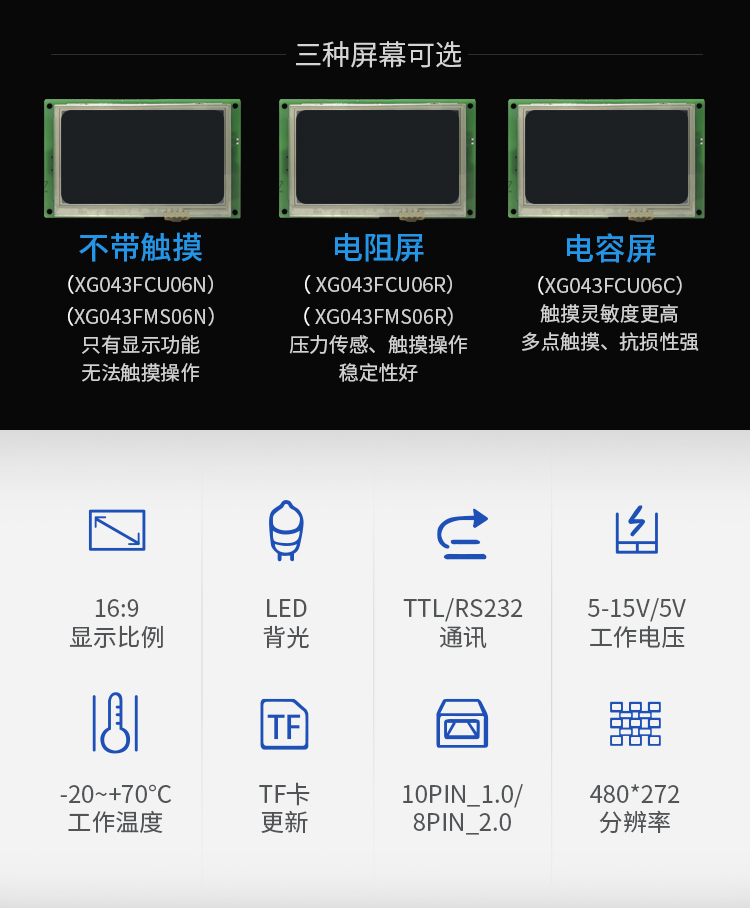 特点描述:XG043FMS06系列产品搭载15vip太阳成SGUS(超级图形应用软件)系统,是基于15vip太阳成串口屏硬件平台研发的拥有自主知识产权的智能图形显示系统。用户可通过SGUS串口智能显示终端轻松实现触控功能,如数据文本录入、按键值返回、增量调节、弹出菜单等;也可以快速实现显示功能,如表盘时钟、图标变量、艺术字、曲线显示、列表显示、文本显示等。