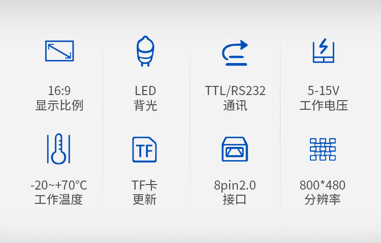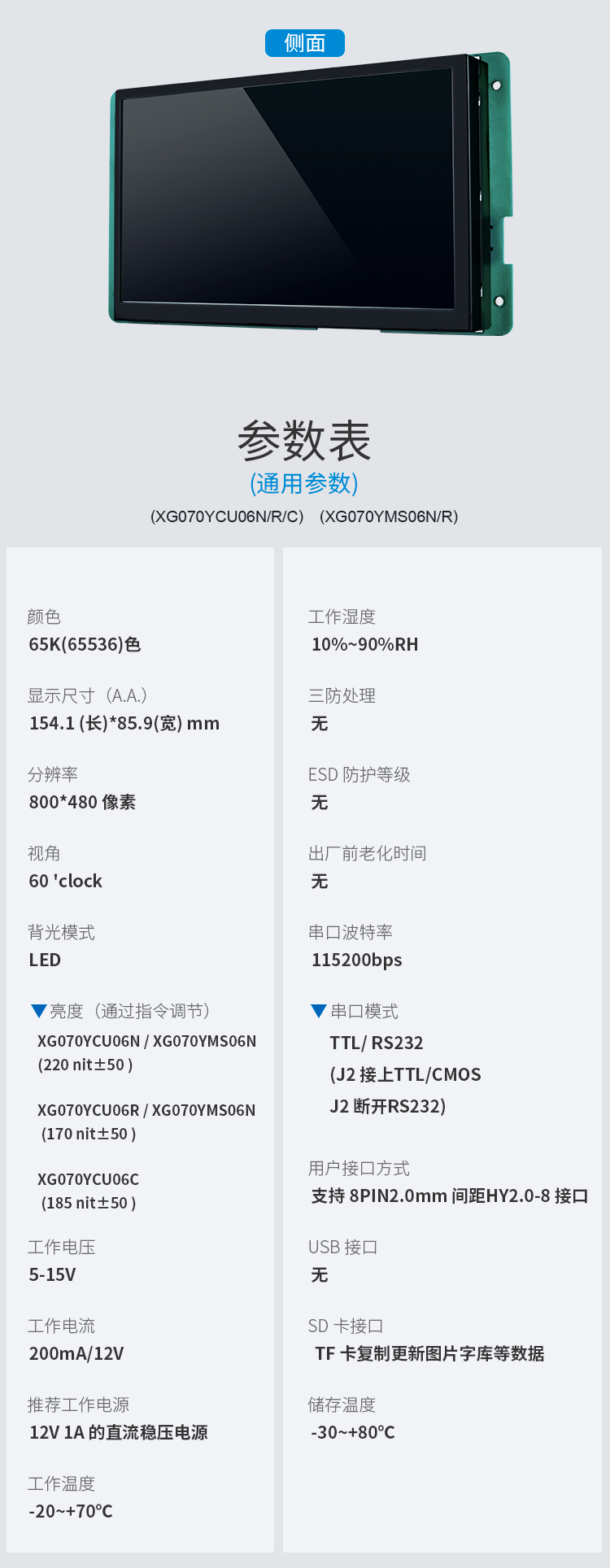 特点描述:XG070YMS06系列搭载15vip太阳成SGUS(超级图形应用软件)系统,是基于15vip太阳成串口屏硬件平台研发的拥有自主知识产权的智能图形显示系统。用户可通过SGUS串口智能显示终端轻松实现触控功能,如数据文本录入、按键值返回、增量调节、弹出菜单等;也可以快速实现显示功能,如表盘时钟、图标变量、艺术字、曲线显示、列表显示、文本显示等。