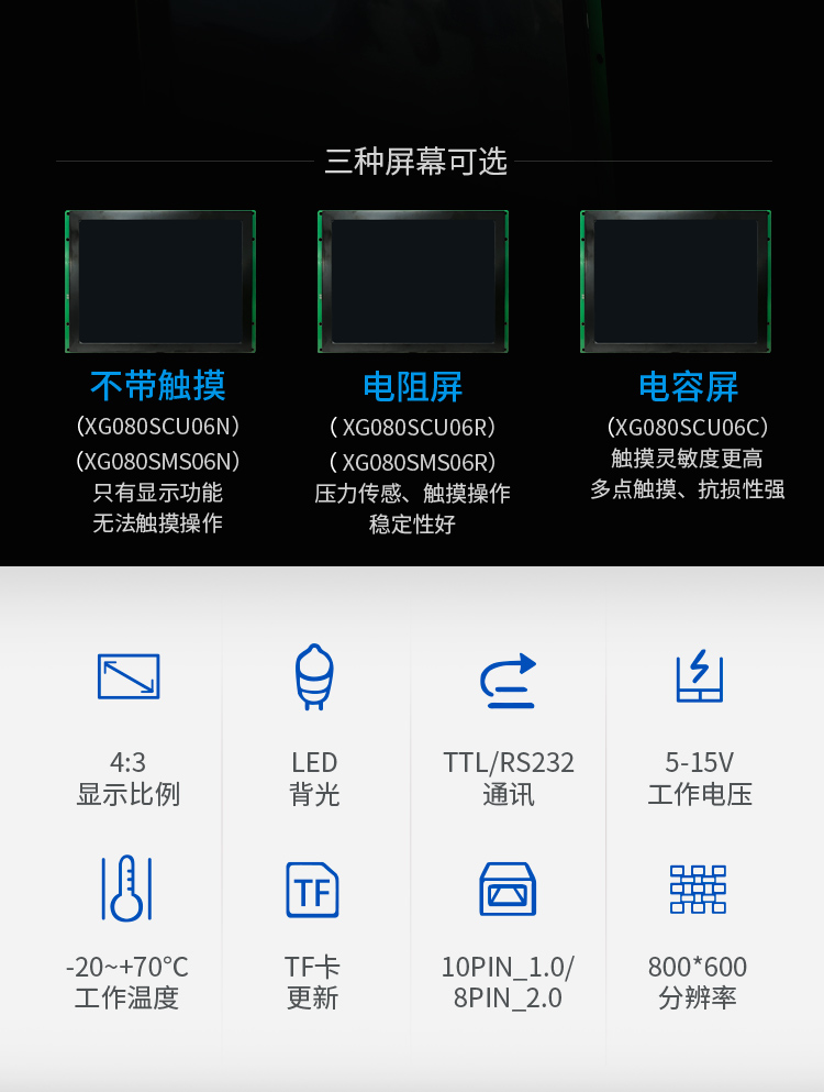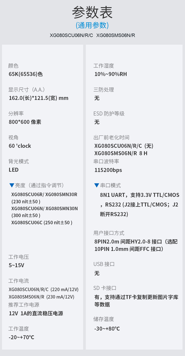 特点描述:XG080SMS06系列搭载15vip太阳成SGUS(超级图形应用软件)系统,是基于15vip太阳成串口屏硬件平台研发的拥有自主知识产权的智能图形显示系统。用户可通过SGUS串口智能显示终端轻松实现触控功能,如数据文本录入、按键值返回、增量调节、弹出菜单等;也可以快速实现显示功能,如表盘时钟、图标变量、艺术字、曲线显示、列表显示、文本显示等。