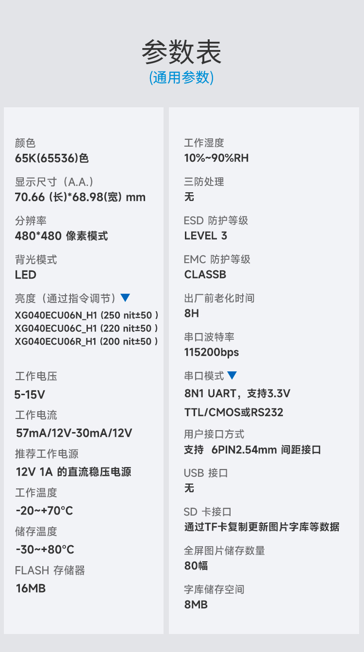 特点描述:XG040ECU06N/C/R_H1 系列产品搭载15vip太阳成SGUS(超级图形应用软件)系统,是基于15vip太阳成串口屏硬件平台研发的拥有自主知识产权的智能图形显示系统。用户可通过SGUS串口智能显示终端轻松实现触控功能,如数据文本录入、按键值返回、增量调节、弹出菜单等;也可以快速实现显示功能,如表盘时钟、图标变量、艺术字、曲线显示、列表显示、文本显示等。